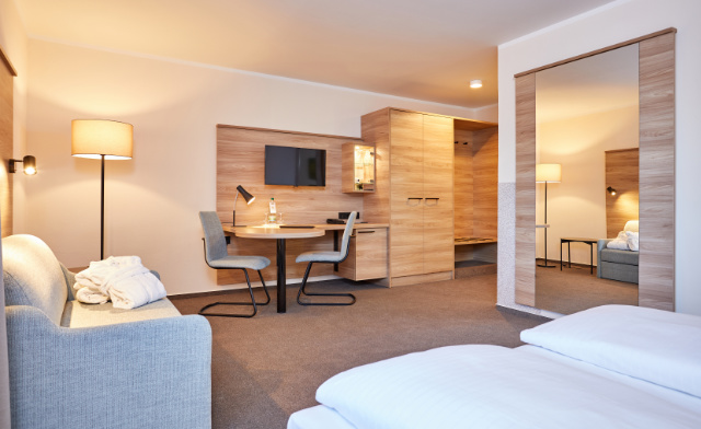 The non-smoking rooms are equipped with a spacious modern bathroom including a shower or bathtub, WC, hairdryer, floor heating, minibar, flat screen TV, telephone, wake-up service and free high-speed Internet connection via Wi-Fi. Bathrobes are available. We also have one barrier-free room and four family rooms.